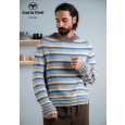 Een gestreepte trui die van boven naar beneden wordt gebreid met een dubbel gevouwen halslijn, zadelschouder en brede geribbelde strepen.