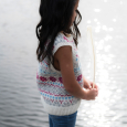 De slipover wordt van beneden naar boven gebreid met steken die doorgeknipt worden bij de armsgaten en de halsopening. Het model heeft een vlotte pasvorm. De boord wordt met verdraaide steken gebreid en het lijf in een patroon met meerdere kleuren. Designer Kristin heeft het patroon in kleuren gemaakt die haar aan de Zweedse zomers aan zee herinneren.
