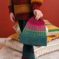 Een kindermuts met een effen gebreide rand die naar binnen dubbelgevrouwen en gebreid is. Het grootste deel van de muts is gemaakt in ribbelsteek met meerkleurig gebreide overgangen tussen verschillende kleuren.