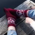 Een ruime sok met Letse vlechten en een sneeuwvlokkenpatroon op de schacht. De sok is gebreid met een versterkte hielkap, effen voet en rechte teen die aan elkaar zijn genaaid met een matrassteek.