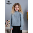 Moderne kindertrui met een kombinatie van een eenvoudige structuurpatroon over het lijf en tricotsteek over de mouwen. De trui is wijd met mouwen met een lekker lange boord aan het uiteinde die je omhoog of omlaag kan vouwen. De achterkant van de trui is iets langer met een ronding aan de boord.