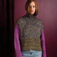 En oversized, gemeleerde  statement-trui met een grote polokraag en meerkleurig gebreide onderkant met de averechte kant naar buiten toe als ook met contrasterende mouwen. De trui wordt van boven naar beneden gebreid, daarna worden de steken voor de mouwen opgepakt in het armsgat en naar beneden gebreid.